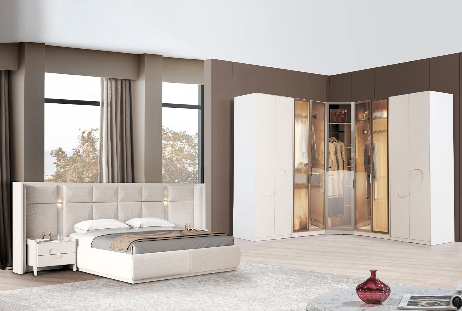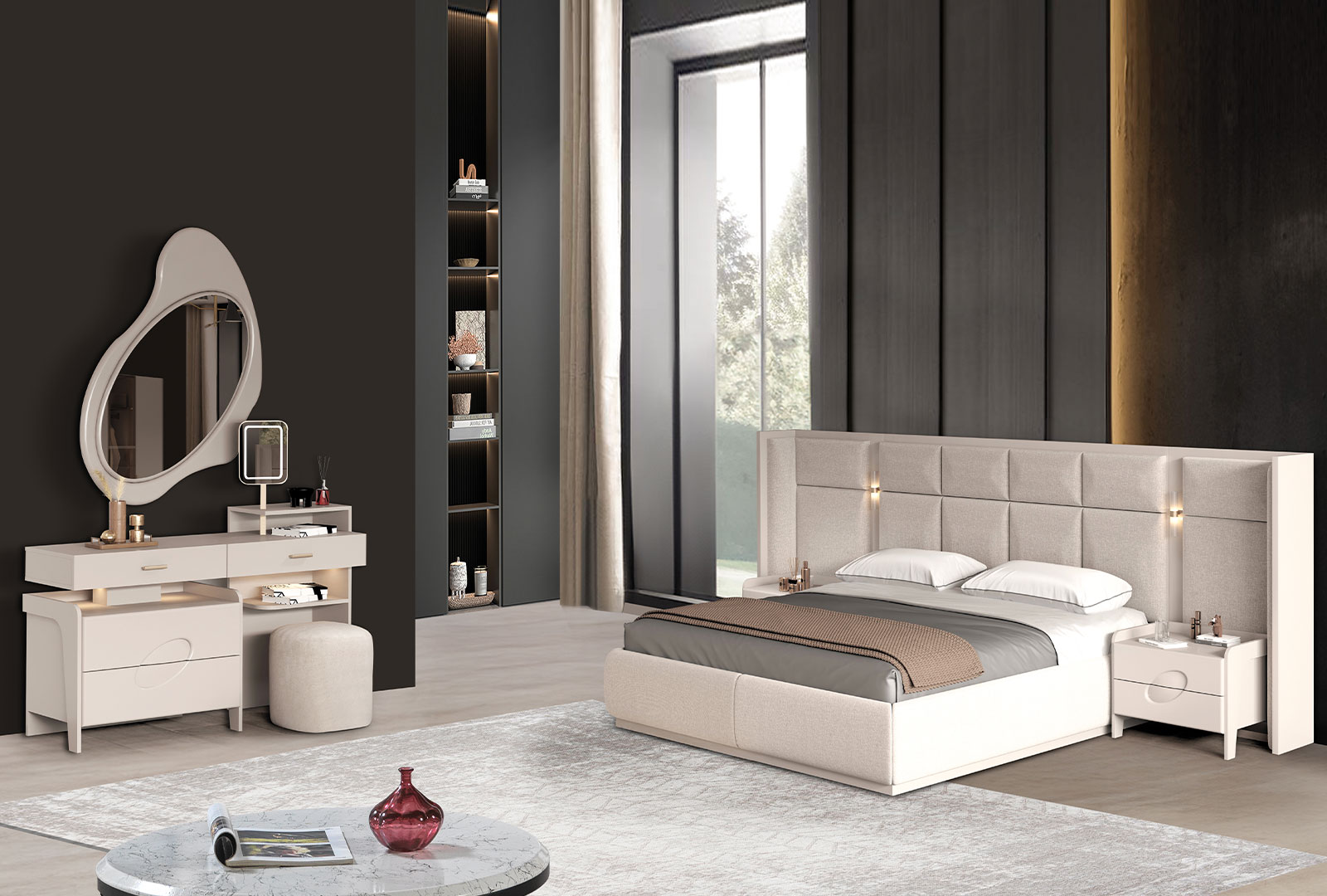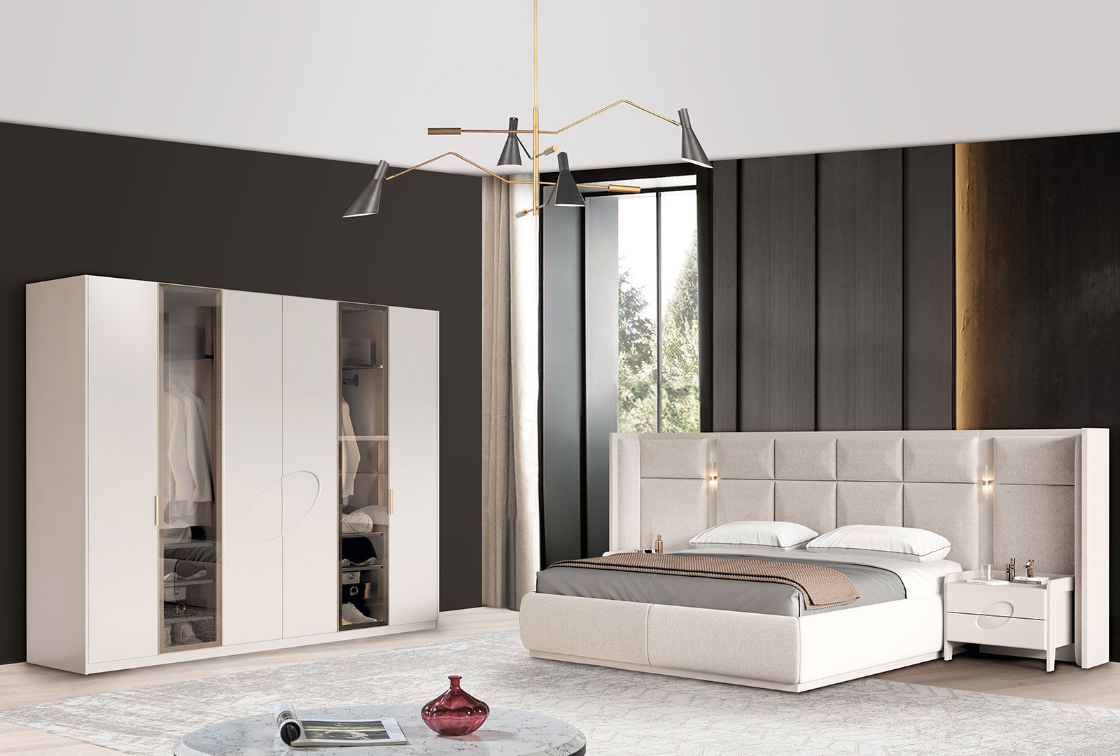 Geniş depolama alanı, estetik başlık tasarımı ve modern çizgileriyle bu yatak odası takımı, hem şıklığı hem de kullanışlı yapısıyla öne çıkar. Kaliteli işçiliği sayesinde uzun ömürlüdür.